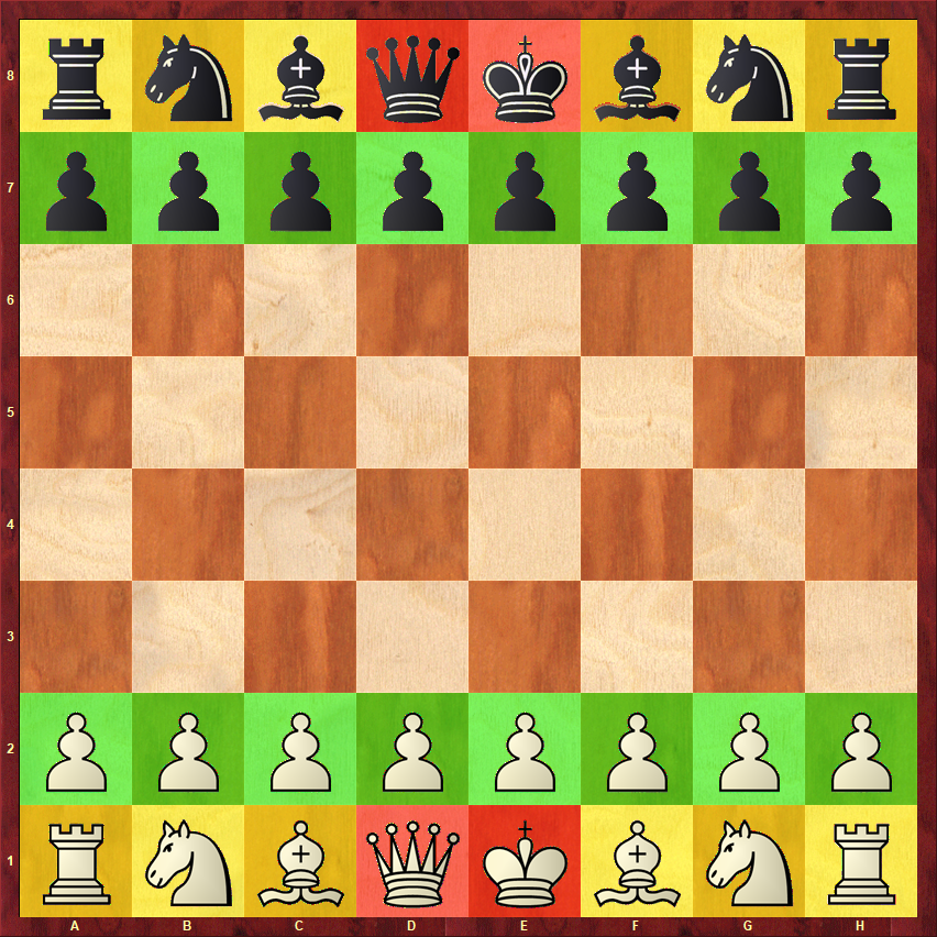 Dáma: vždy na poli svojej farby – biela dáma na d1 (biele políčko).