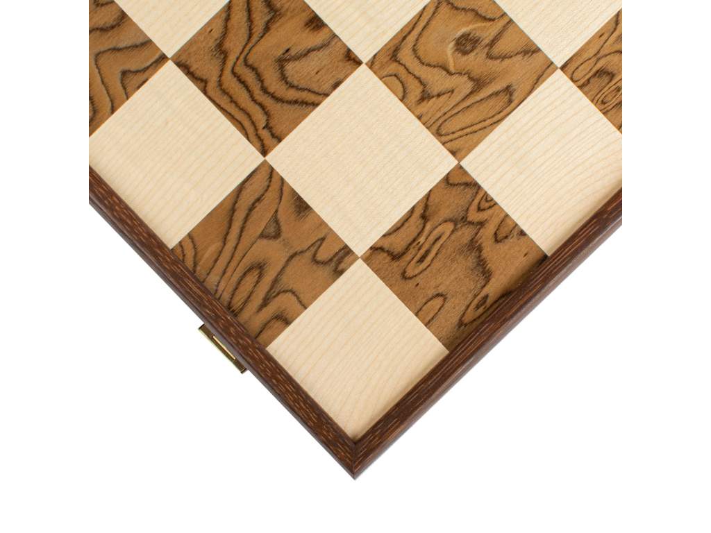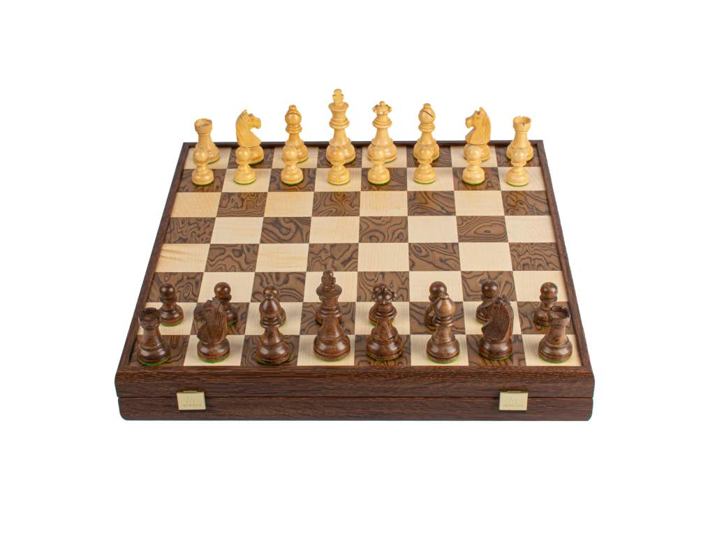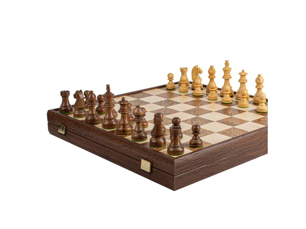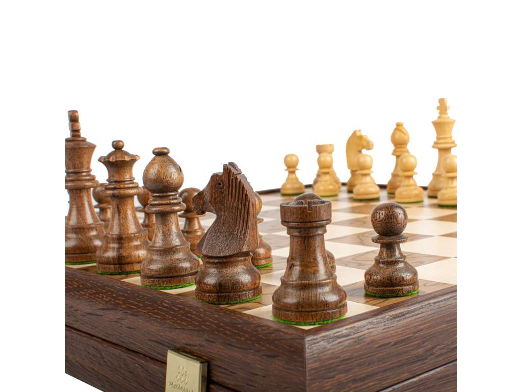 Luxusné materiály: Šachovnica s rozmermi 43 x 43 cm je vyrobená z orechového dreva a dubu, čo jej dodáva sofistikovaný vzhľad a odolnosť.