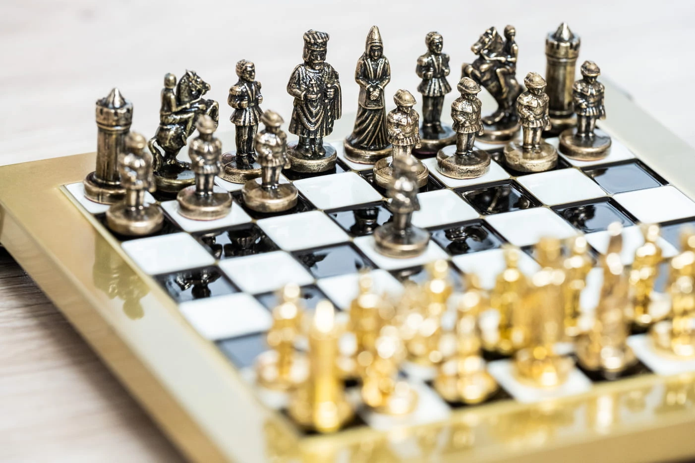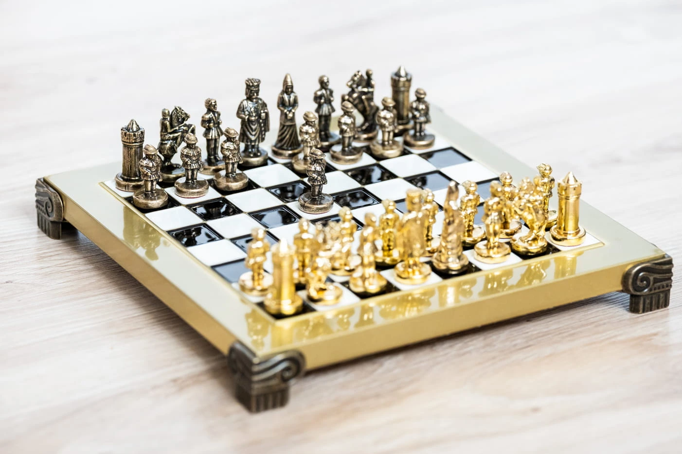 - Kovové figúrky: Obsahuje zlaté a hnedé kovové šachové figúrky, ktoré dodávajú luxusný vzhľad.