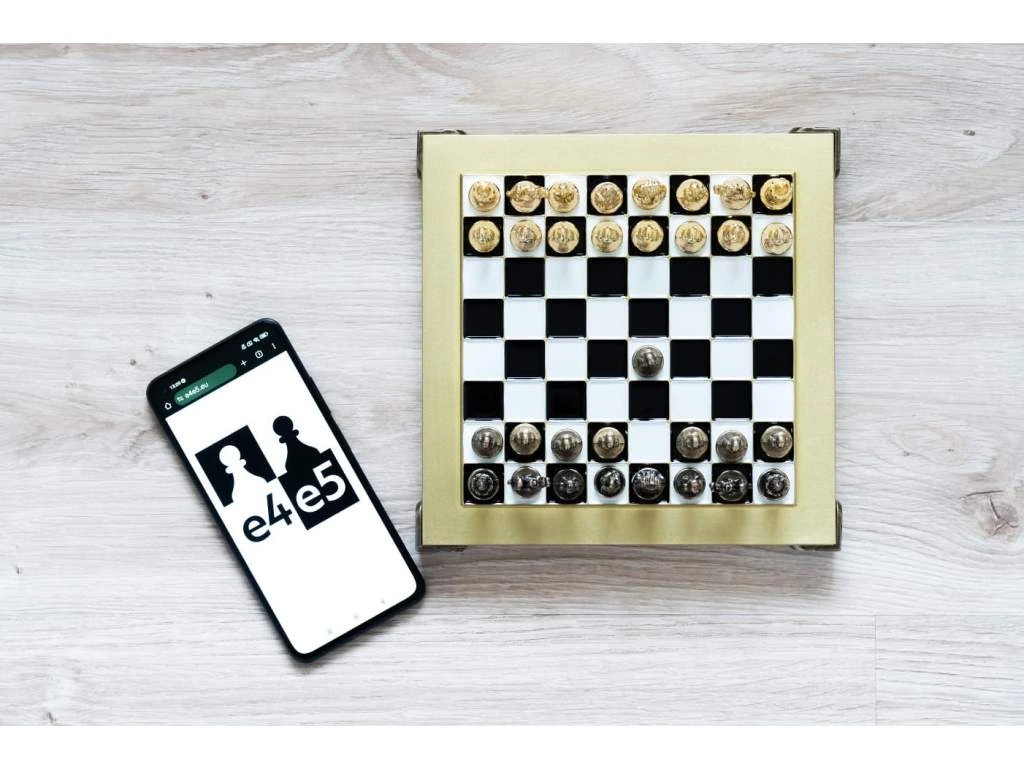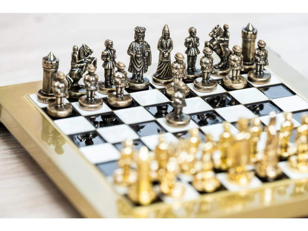 - Kovové figúrky: Obsahuje zlaté a hnedé kovové šachové figúrky, ktoré dodávajú luxusný vzhľad.