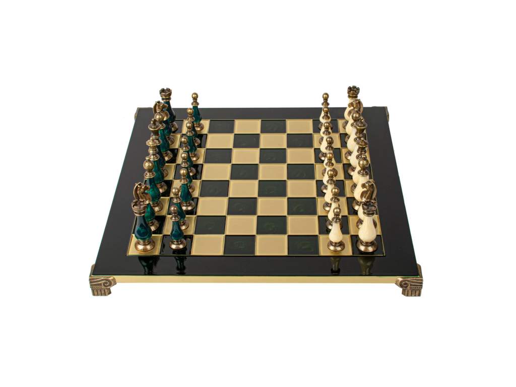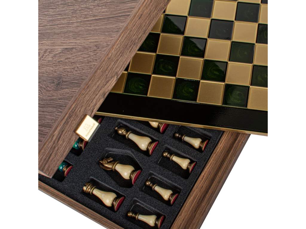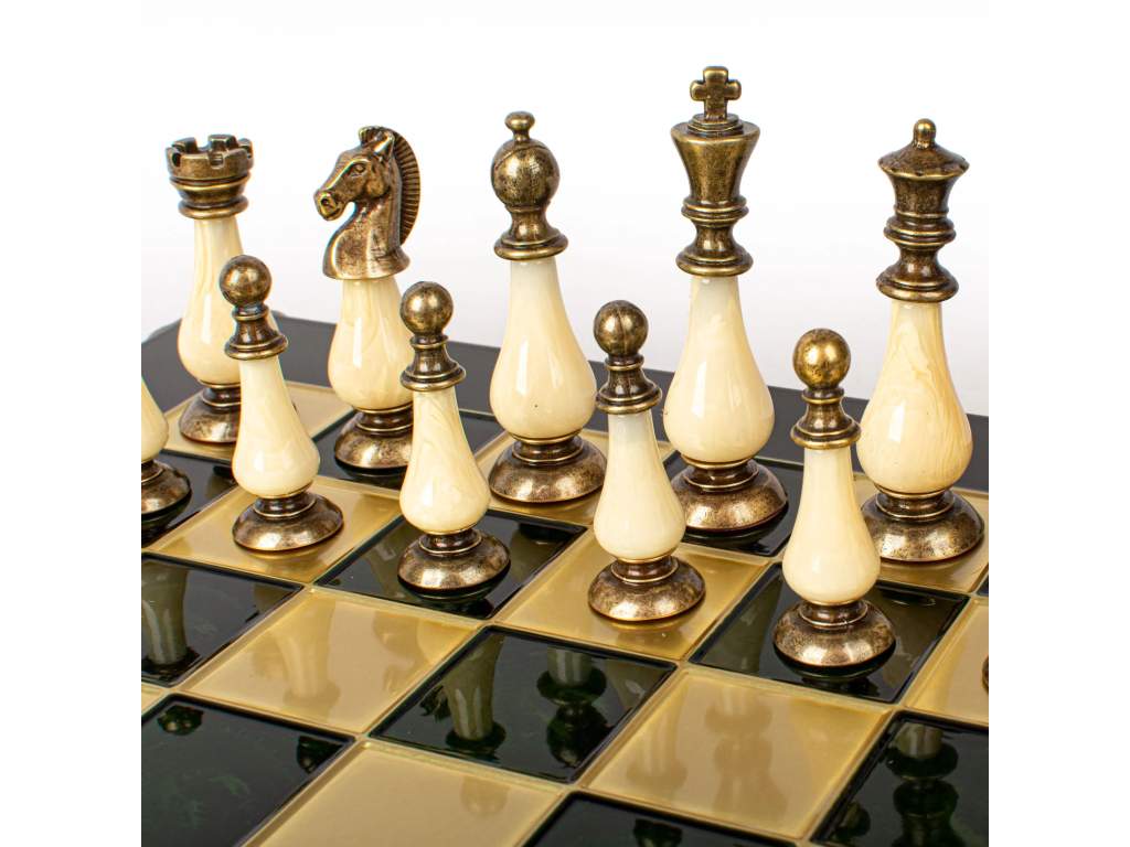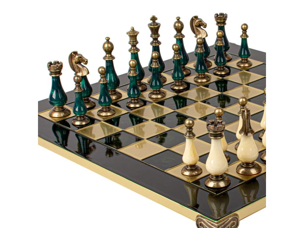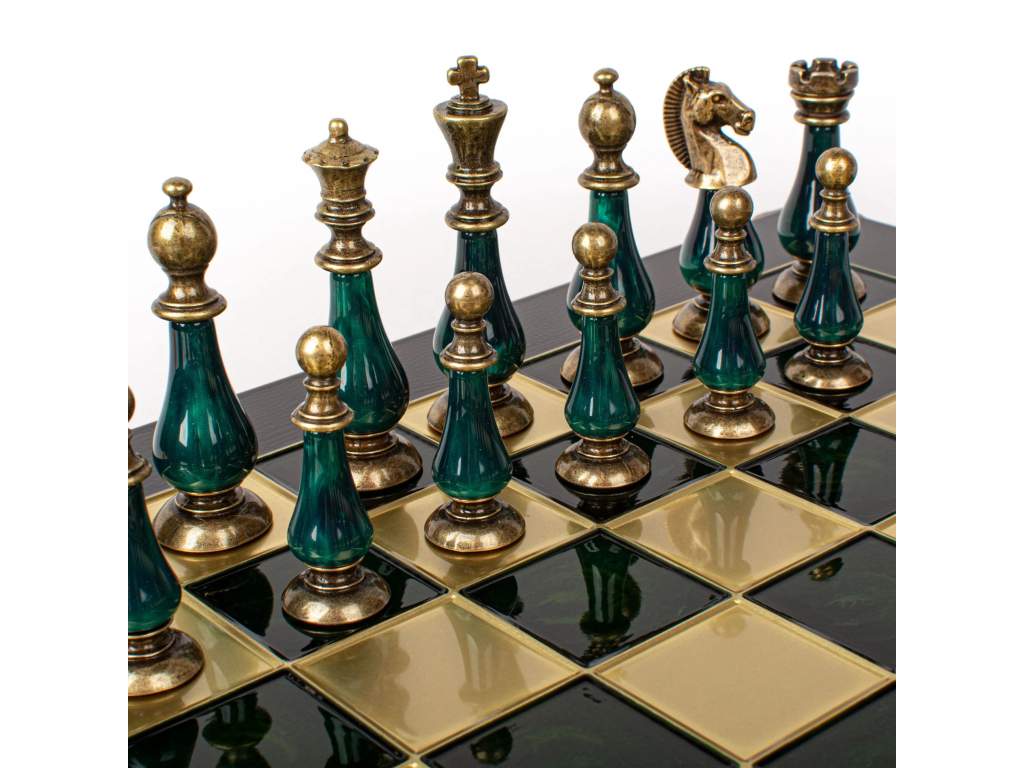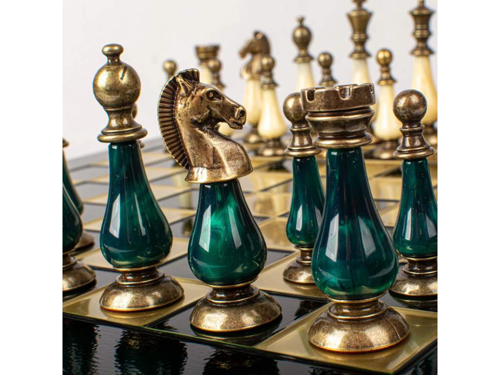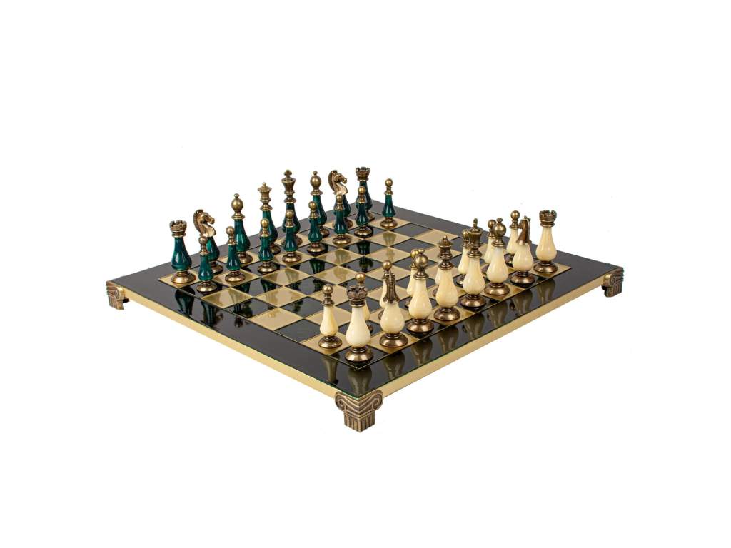 Šachové figúrky Staunton: Šachové figúrky Staunton, známe a obľúbené po celom svete, sú pomenované po Howardovi Stauntonovi, jednom z najlepších hráčov svojej doby. Jazdec, najzložitejšia a najvýraznejšia figúrka v každej šachovej súprave, má realisticky vyrezávanú hlavu koňa, pravdepodobne inšpirovanú sochou na východnom štíte Parthenónu. Kovové figúrky Staunton od Manopoulos krásne podčiarkujú architektonickú históriu týchto originálnych figúrok a zároveň zachovávajú ich nadčasový dizajn.