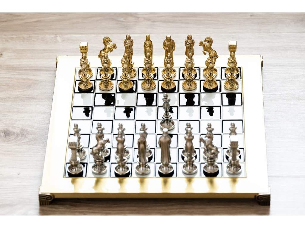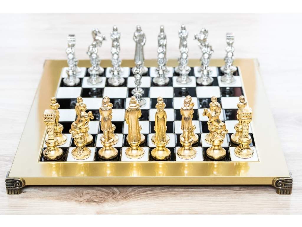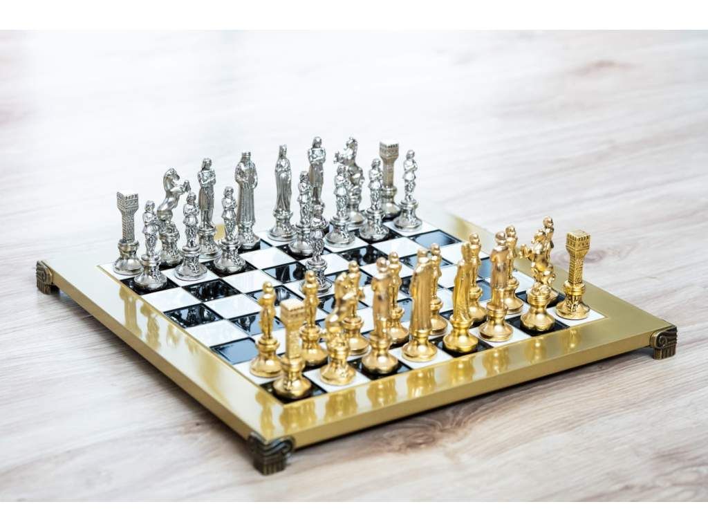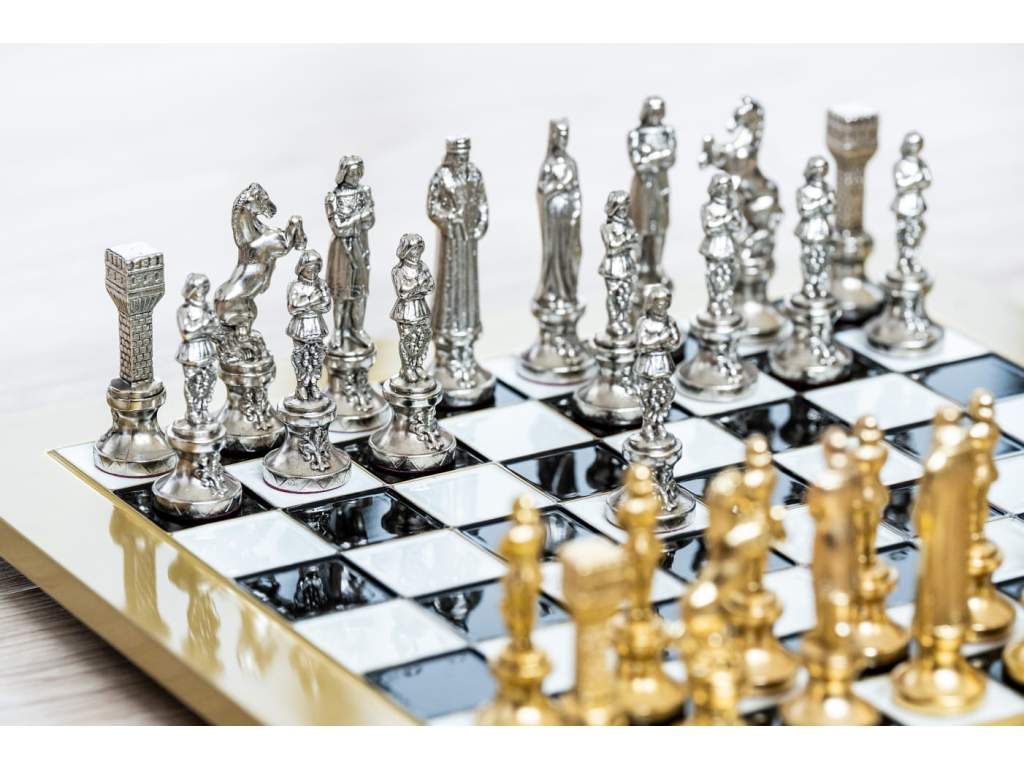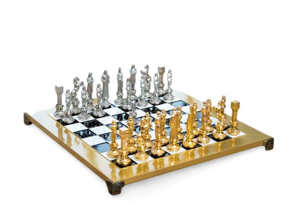 - Ručne vyrábané šachové figúrky z masívnej mosadze so zlatým a strieborným povrchom