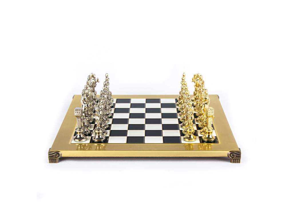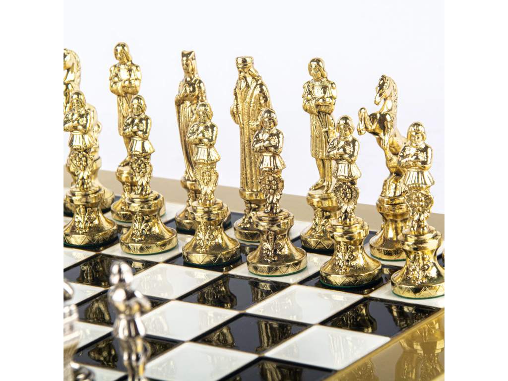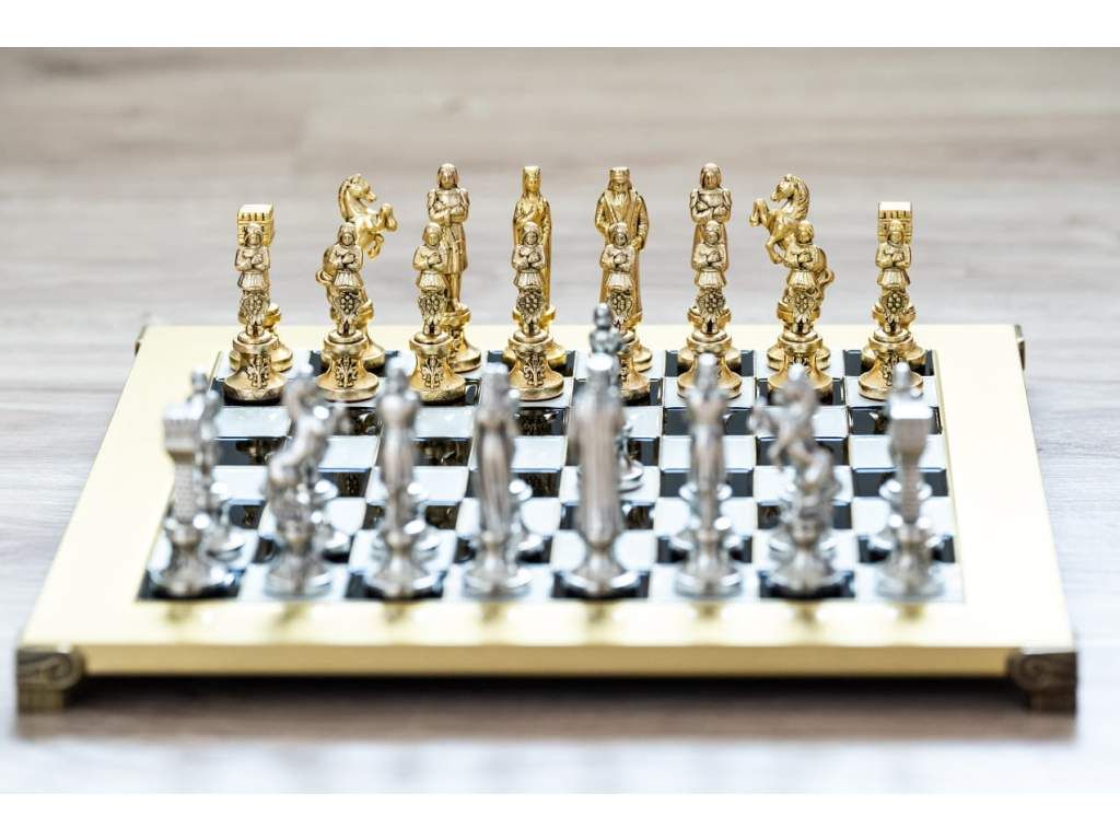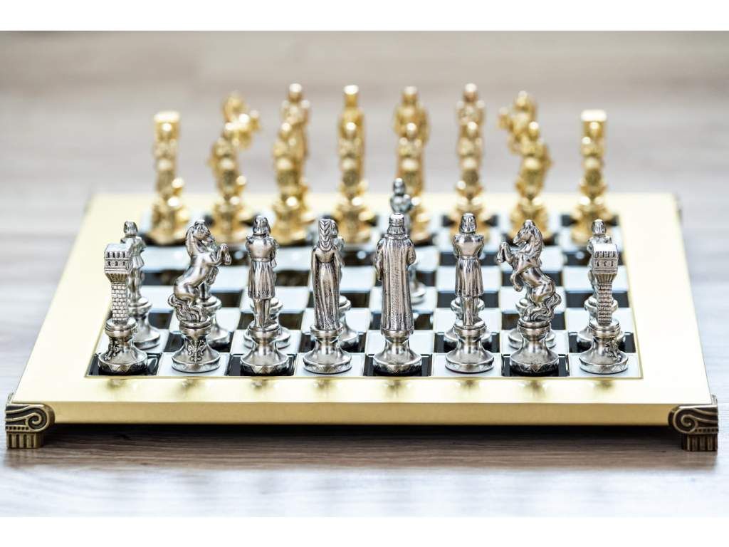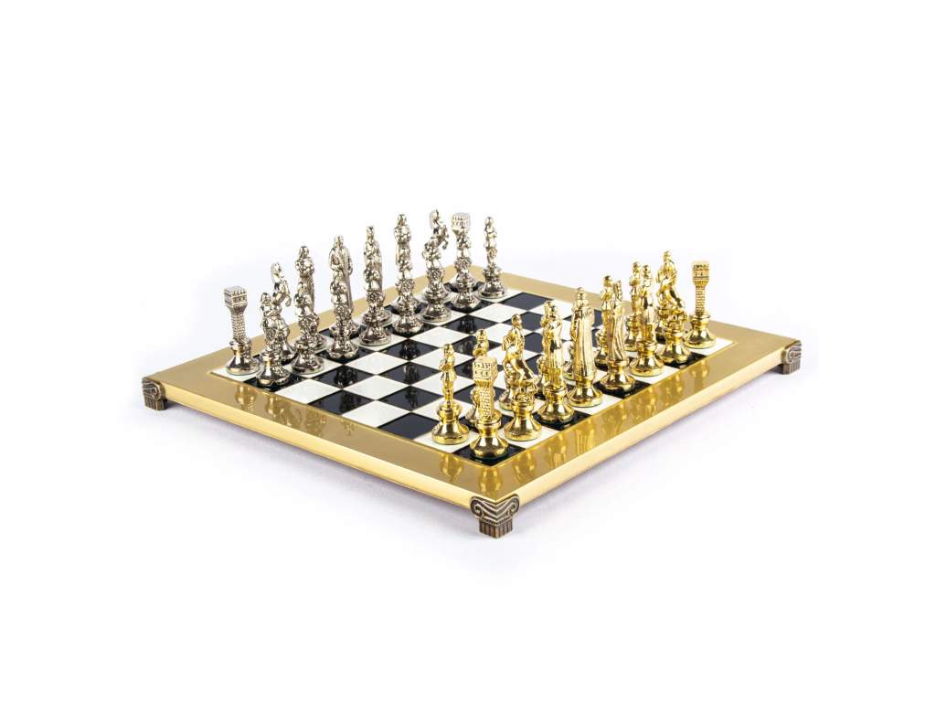 - Ručne vyrábané šachové figúrky z masívnej mosadze so zlatým a strieborným povrchom