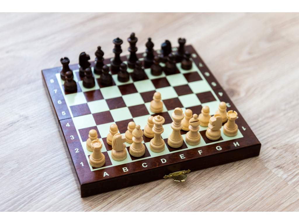 Šikovná maličká drevená šachová súprava s magnetom vo figúrkach vhodná na cestovanie ako aj bežné hranie.